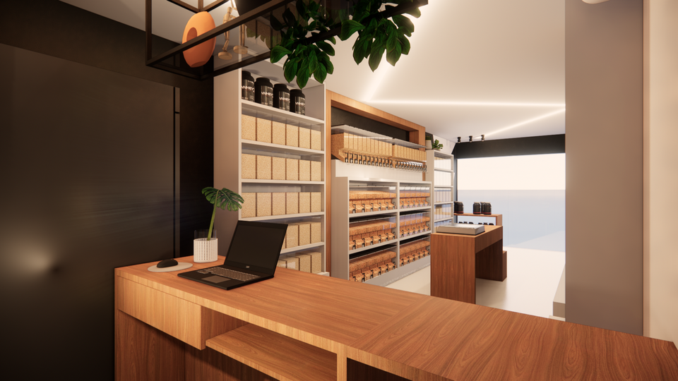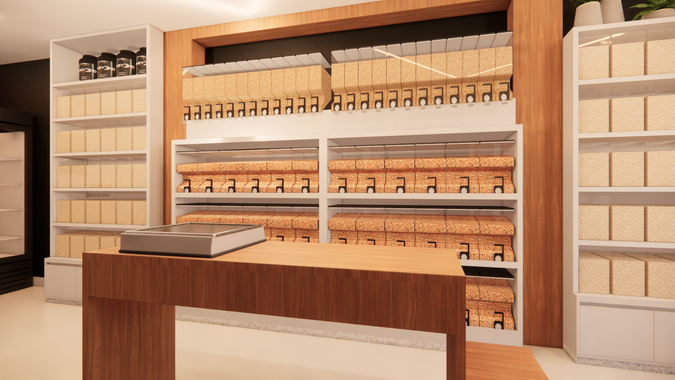 Espaço comercial focado na venda de suplementos e grãos. Criamos um projeto 100% personalizado para a nova marca que poderá futuramente se tornar um rede de franquias. Todo o mobiliário foi planejado de forma modular que criaçao de novos pontos de venda.